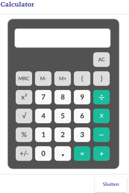 De calculator in Rekensite kunnen leerlingen gebruiken bij het maken van de opdrachten. Deze vinden ze in de menubalk boven aan het scherm.Bij sommige opdrachten staat dat de rekenmachine niet gebruikt mag worden.