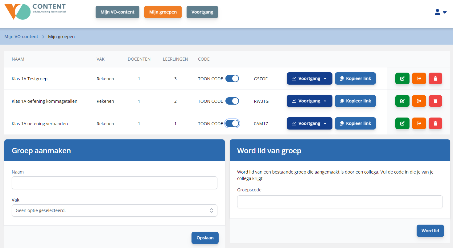 Groepen aanmakenIn Mijn VO-content vind je bovenin de grijze knop ‘Mijn groepen’: Voeg als docent een groep toe. Geef de groep een naam en koppel deze aan een vak. Deel de code van de groep met je leerlingen (bijvoorbeeld F6HDZ).