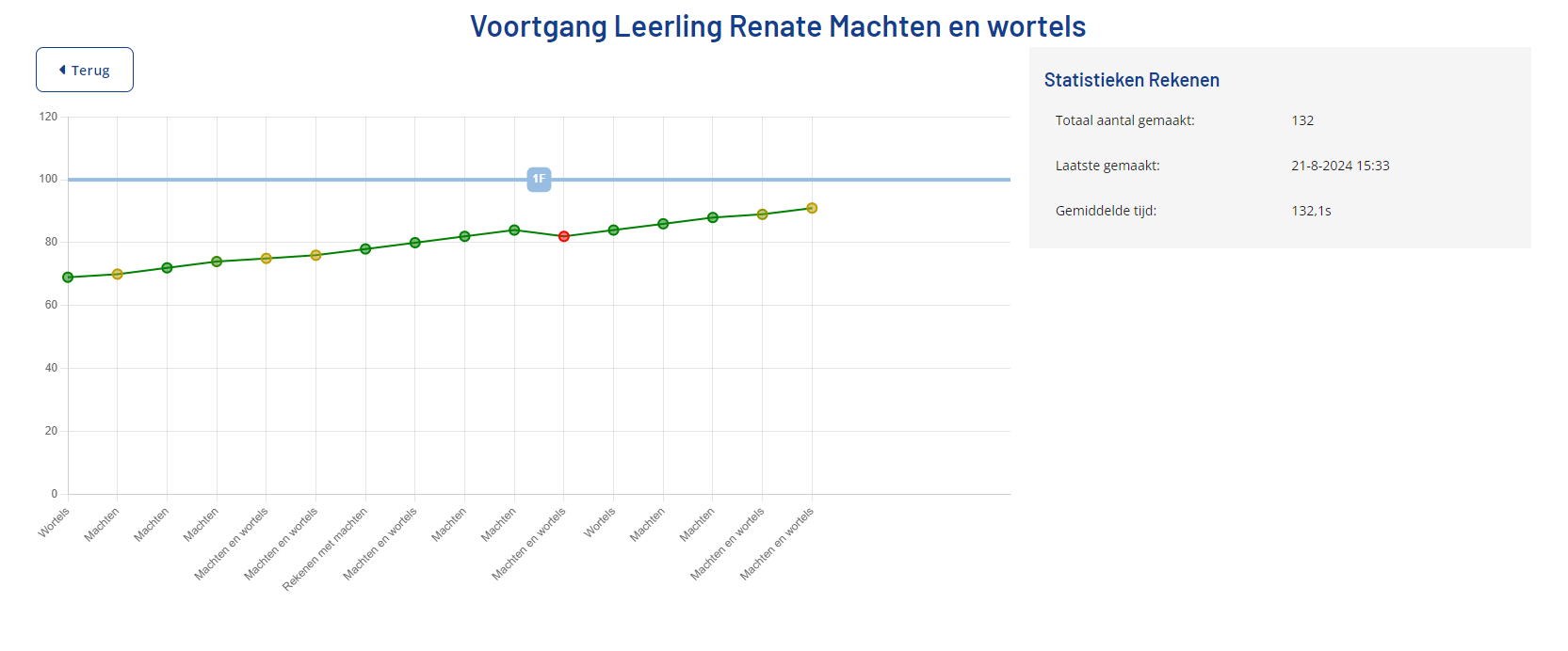 In de lijndiagram is op de lijn van de leerling met bolletjes aangegeven welke opdrachten zijn geoefend.Door met je muis over de bolletjes te gaan, zie je: