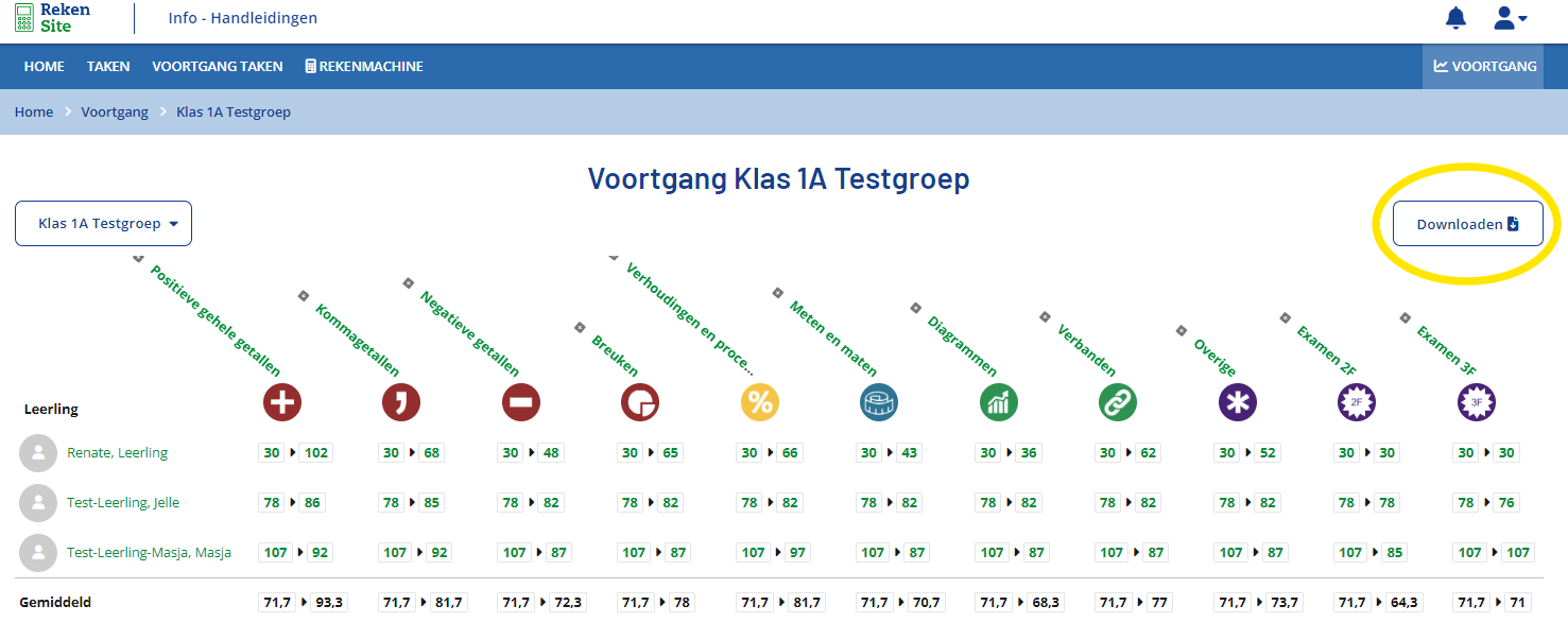 Als docent kun je de klas- en leerlinggegevens per categorie en subcategorie downloaden als CSV- of Excel-bestand.Ga naar 'mijn voortgang', klik een groep aan en klik op de knop 'Downloaden' (geel gearceerd in de afbeelding hieronder).