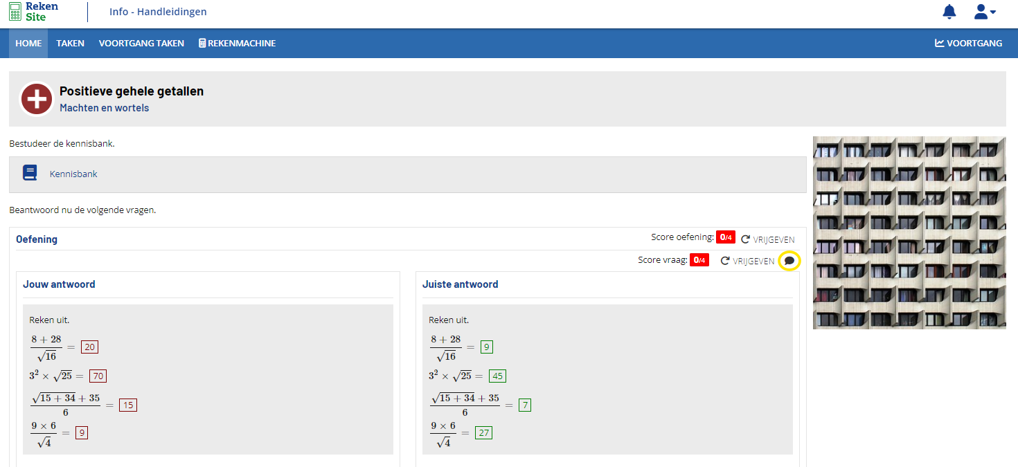 Als docent kun je per door de leerling gemaakte opdracht je feedback geven (via het spreekwolkje, geel gearceerd in de afbeelding hieronder). Ook kun je de opdracht vrijgeven. Dit zorgt ervoor dat de leerling de vraag opnieuw kan maken.