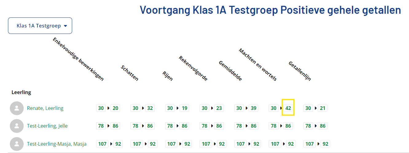 Om de voortgang van een leerling van de subcategorie 'Machten en wortels' te bekijken, kies je een leerling en klik je onder 'Machten en wortels' op het getal 42 (geel gearceerd):