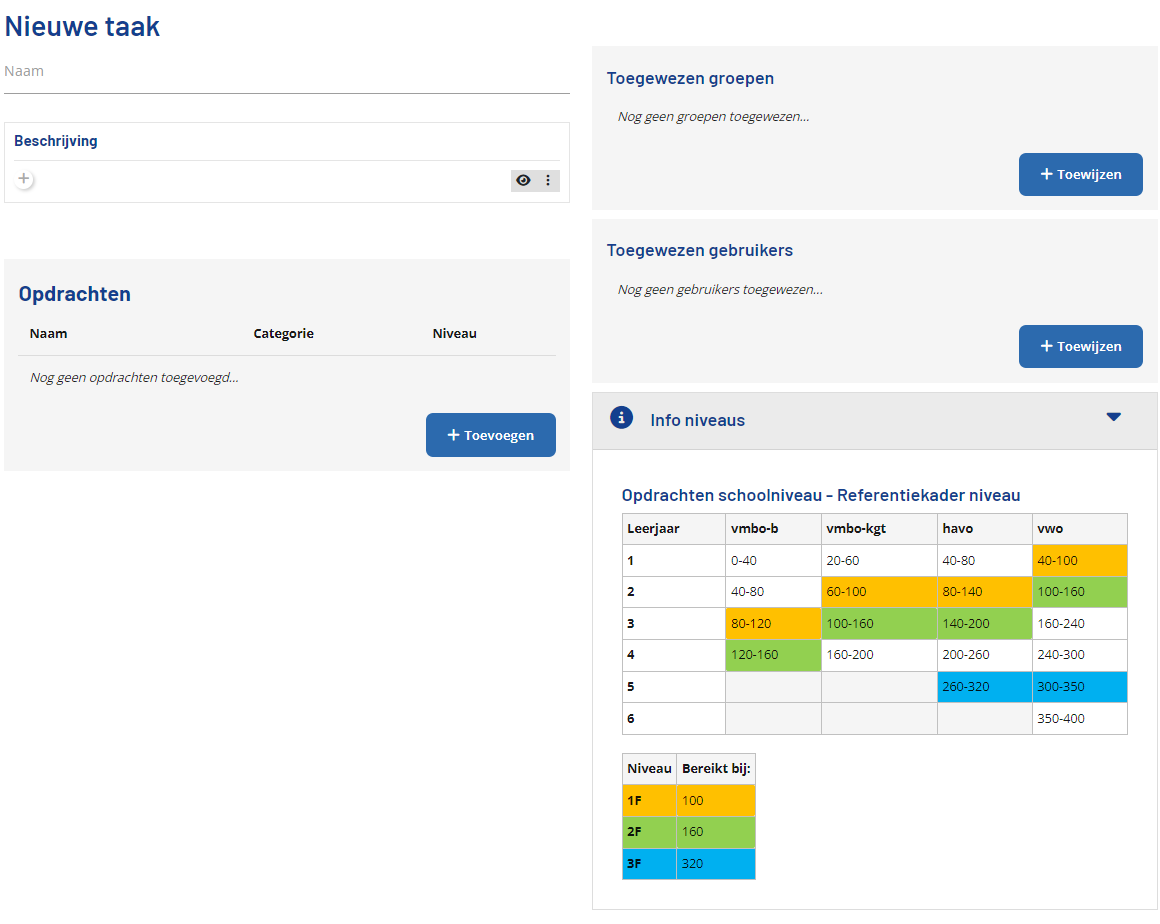 Nieuwe taak toevoegenJe kunt er opdrachten toevoegen op naam-niveau-categorie-subcategorie. In de taak kun je een instructietekst/afbeelding/filmpje toevoegen en eventueel een begin- en einddatum en tijdsduur koppelen aan de taak. De taak kun je aan een groep of gebruikers toewijzen.Rechtsonder zie je een overzicht van opdrachten op Referentiekaderniveau.