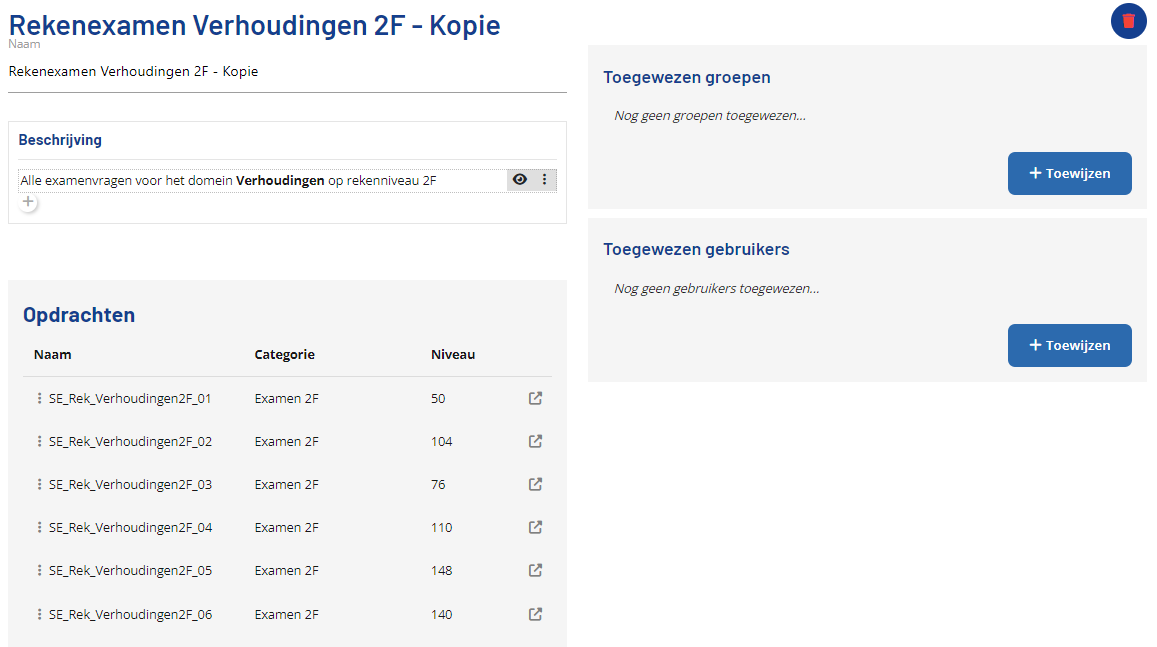 Rekensite taak kopiërenOm een taak te kopiëren, selecteer je een Rekenexamen op 2F- of 3F-niveau. De taak kun je aan groepen of gebruikers toewijzen.