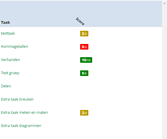 Voortgang taken Voor taken wordt de voortgang apart bijgehouden onder de knop ‘Voortgang taken’ links in de blauwe balk. Onder deze knop is alleen de voortgang van taken zichtbaar, en niet die van de adaptieve taken. Het is wel mogelijk dat in het adaptieve programma een opdracht uit een taak terugkomt voor een leerling.Door op de score van een taak te klikken, zie je de gemaakte opgaven.