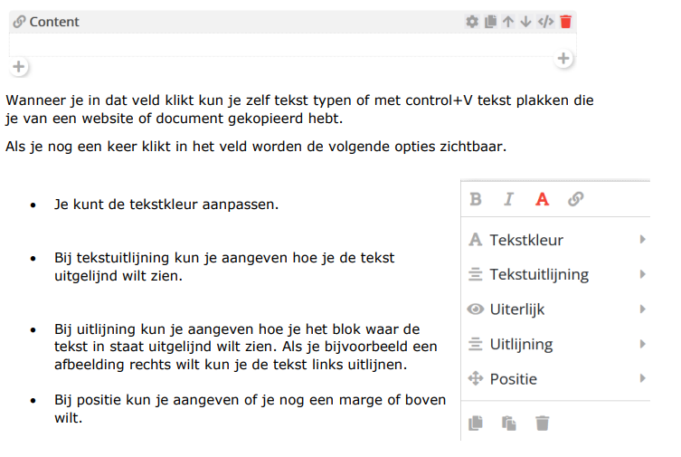 Bovenaan je scherm staat de knop 'ELEMENT TOEVOEGEN'. Klik op 'content'. Wanneer je een content element hebt toegevoegd verschijnt dit veld onderaan de pagina.